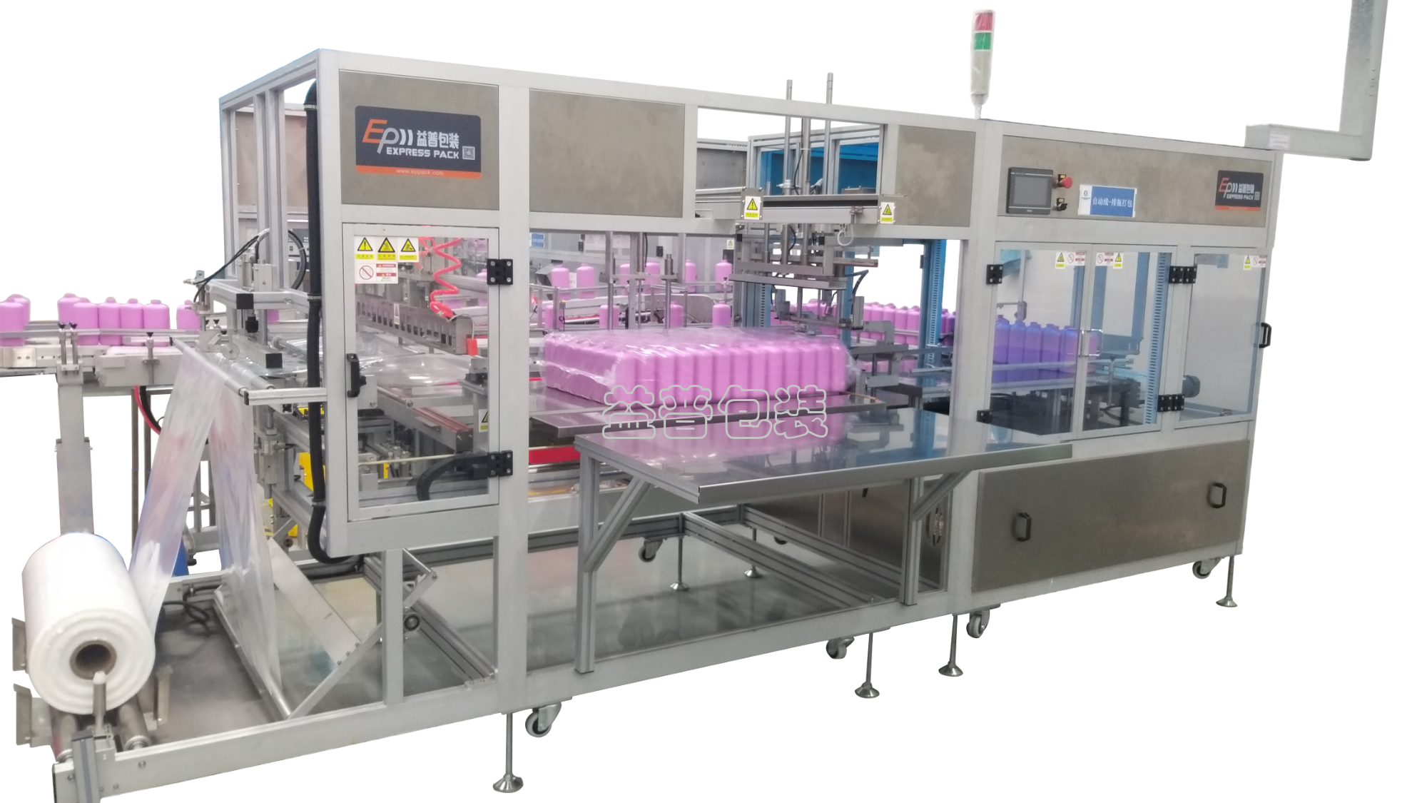 本機由排瓶輸送線、計數排瓶裝置、套袋封口機構,封切機構,套袋機械手構成。 自動套袋機械手將移動至取袋工位,完成制袋與套袋工序。產品由進瓶輸送線送入排瓶推移工位,當排瓶臺上的產品排列達到設定的行列數時,入袋推瓶裝置啟動,將排列好的瓶子推入套好的袋內并完成封口。人工或由機械手將袋取出。套袋機械手移動至取袋工位,重復以上過程。