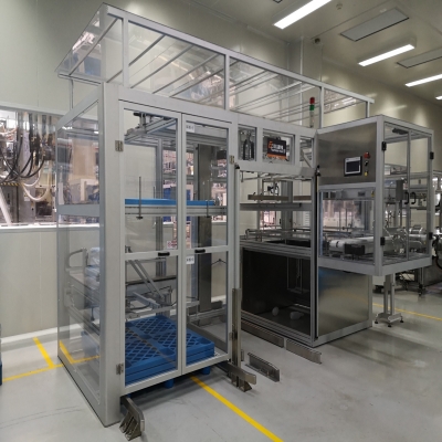 將包裝好的整垛空瓶由叉車叉到鏈條輸垛上,經鏈條輸送到解包平臺邊上,人工解開纏繞膜...